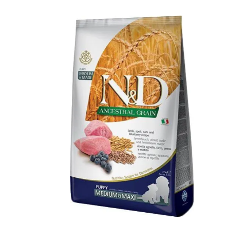 N&D LOW GRAIN DOG LAMB&BLUEBERRY PUPPY MEDIUM&MAXI повнораціонний корм із низьким вмістом зерна для цуценят середніх та великих порід, вагітних і собак, що годують, (ягня, чорниця), який містить обмежену кількість спадкових злаків (спельта та овес).